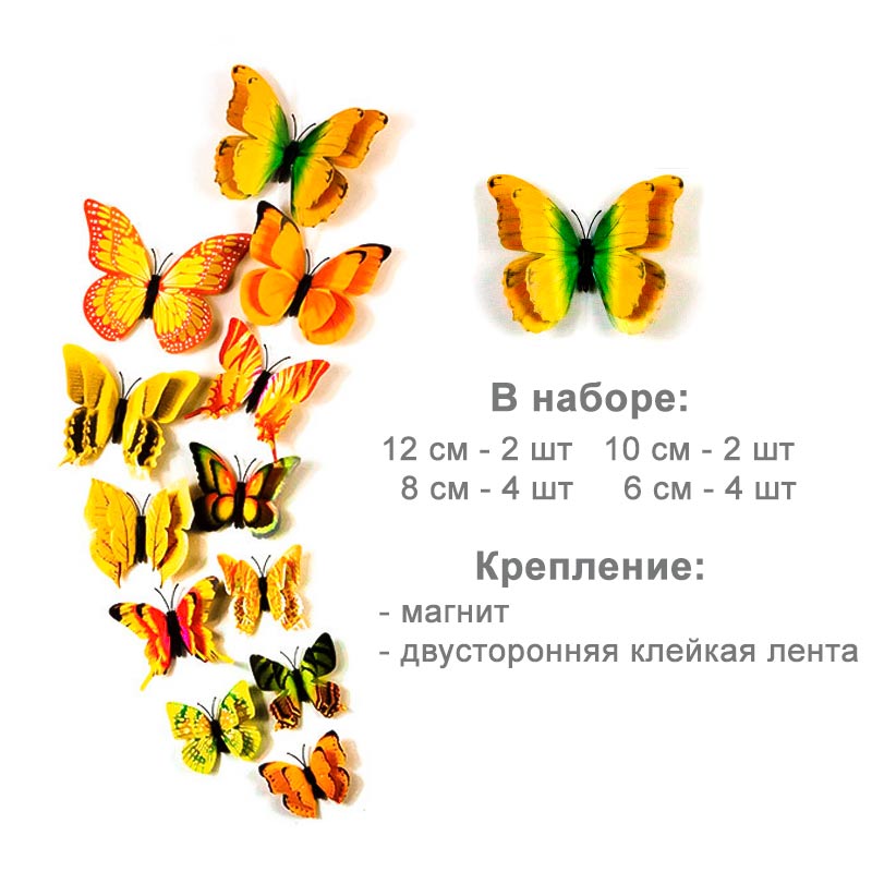 Бабочки выполнены из пластика, крепятся с помощью магнита, так же в комплект входит двухсторонняя клейкая лента.