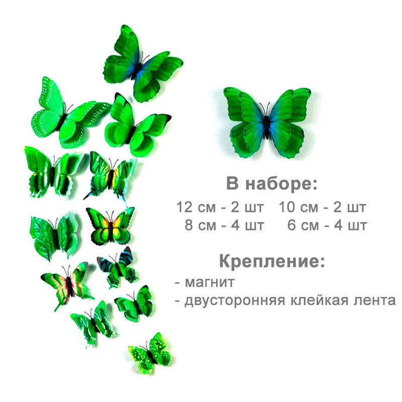 Бабочки на магните двойные пластиковые 12 шт зеленый с рис.