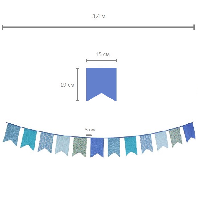 Гирлянда состоит из 12 флажков, общая длина составляет 3,4 м, расстояние между флажками 3 см, длина матерчатых флажков 2,1 м, длина лямок с обеих сторон по 50 см