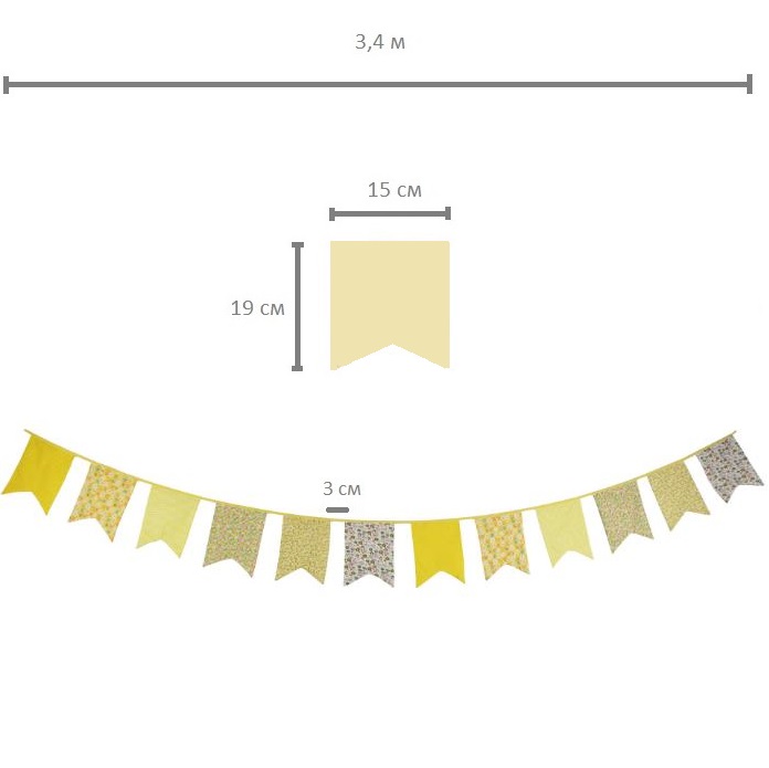 Гирлянда состоит из 12 флажков, общая длина составляет 3,4 м, расстояние между флажками 3 см, длина матерчатых флажков 2,1 м, длина лямок с обеих сторон по 50 см