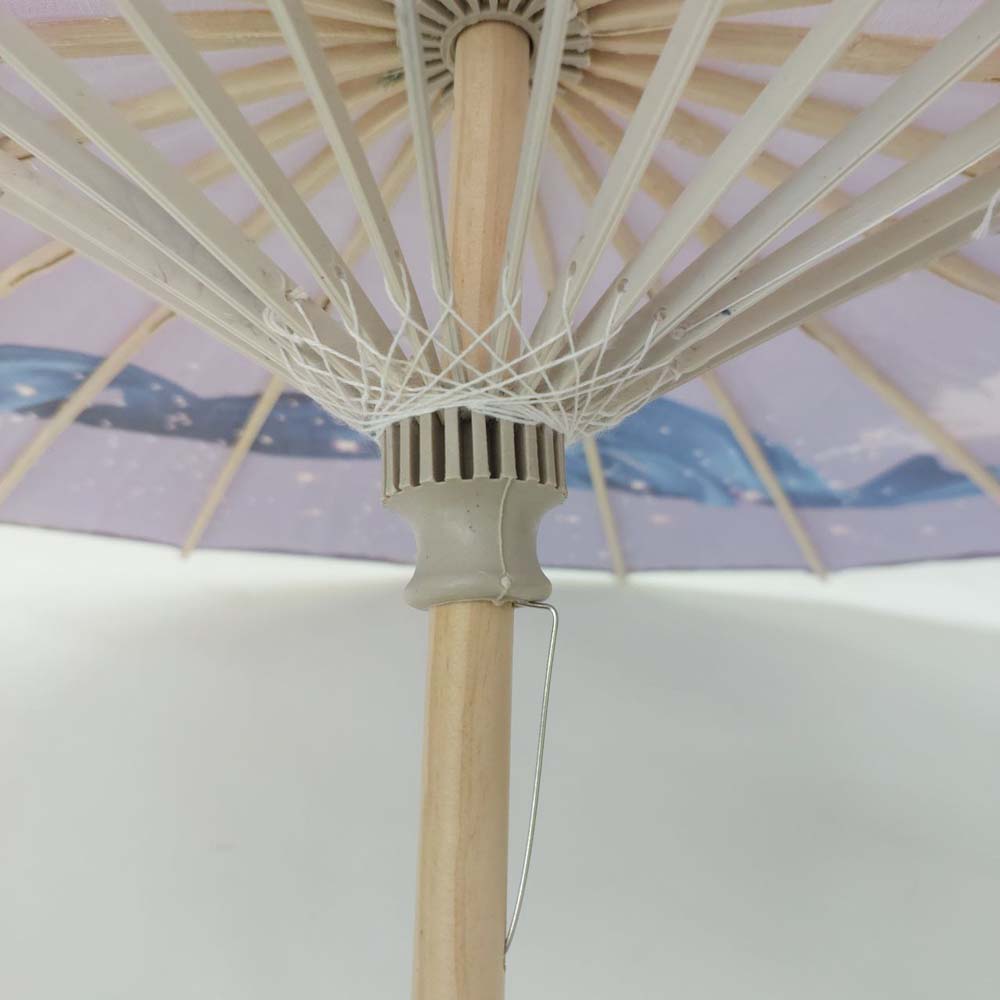 Каркас зонтика выполнен из дерева,купол зонта изготовлен из водоотталкивающего материала,который не пропускает воду.