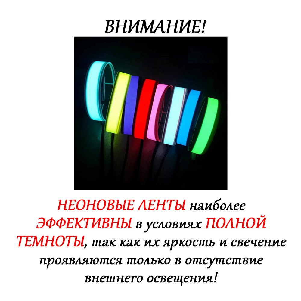 Неоновые ленты наиболее эффективны в условиях полной темноты, так как их яркость и свечение проявляются только в отсутствие внешнего освещения!