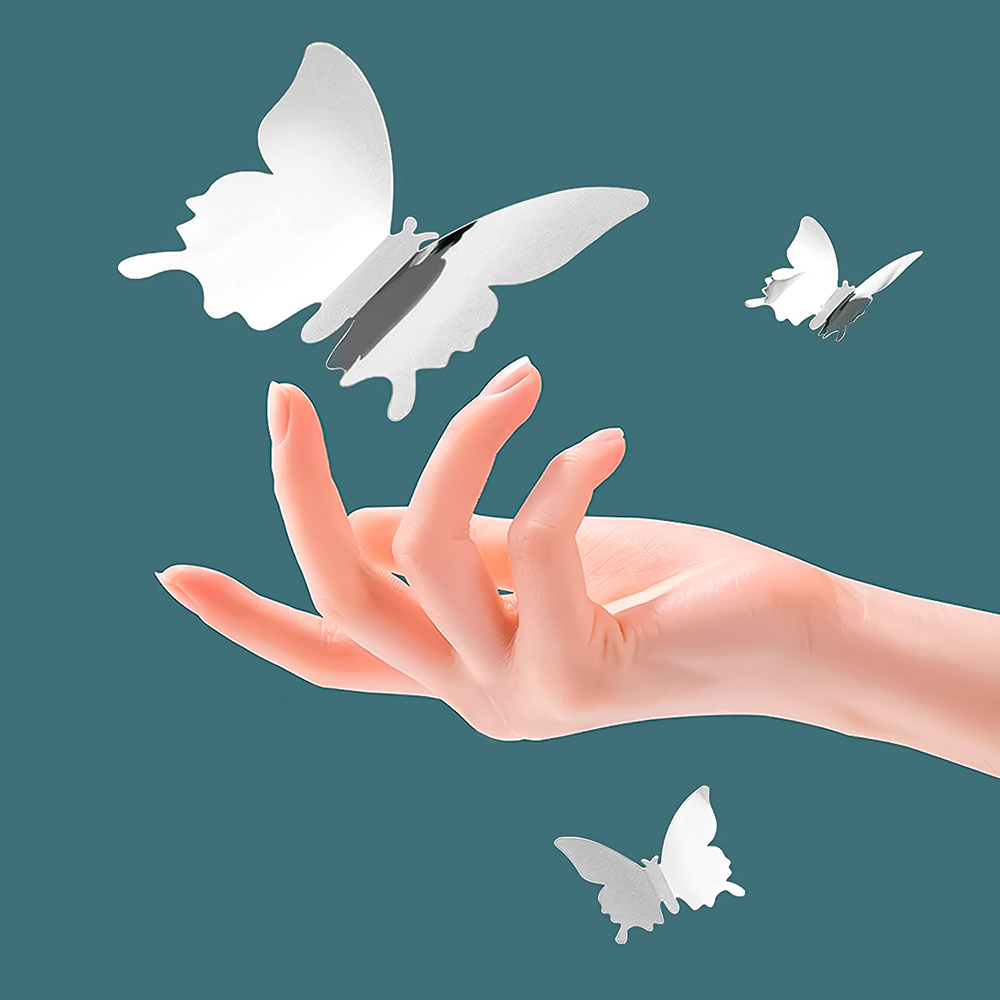 Пластиковые бабочки, двухцветные с внутреней стороны серебро, крепятся с помощью двухсторонней клейкой ленты, которая идет в комплекте.