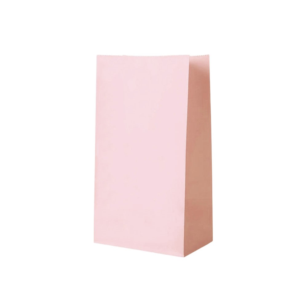 Подарочный пакет из крафтовой бумаги пастельного оттенка с белыми бумажными ручками и белой внутренней стороной.
