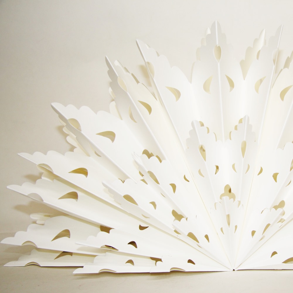 Снежинка на липучках размером 45 см, белого цвета, изготовлена из высококачественной бумаги.