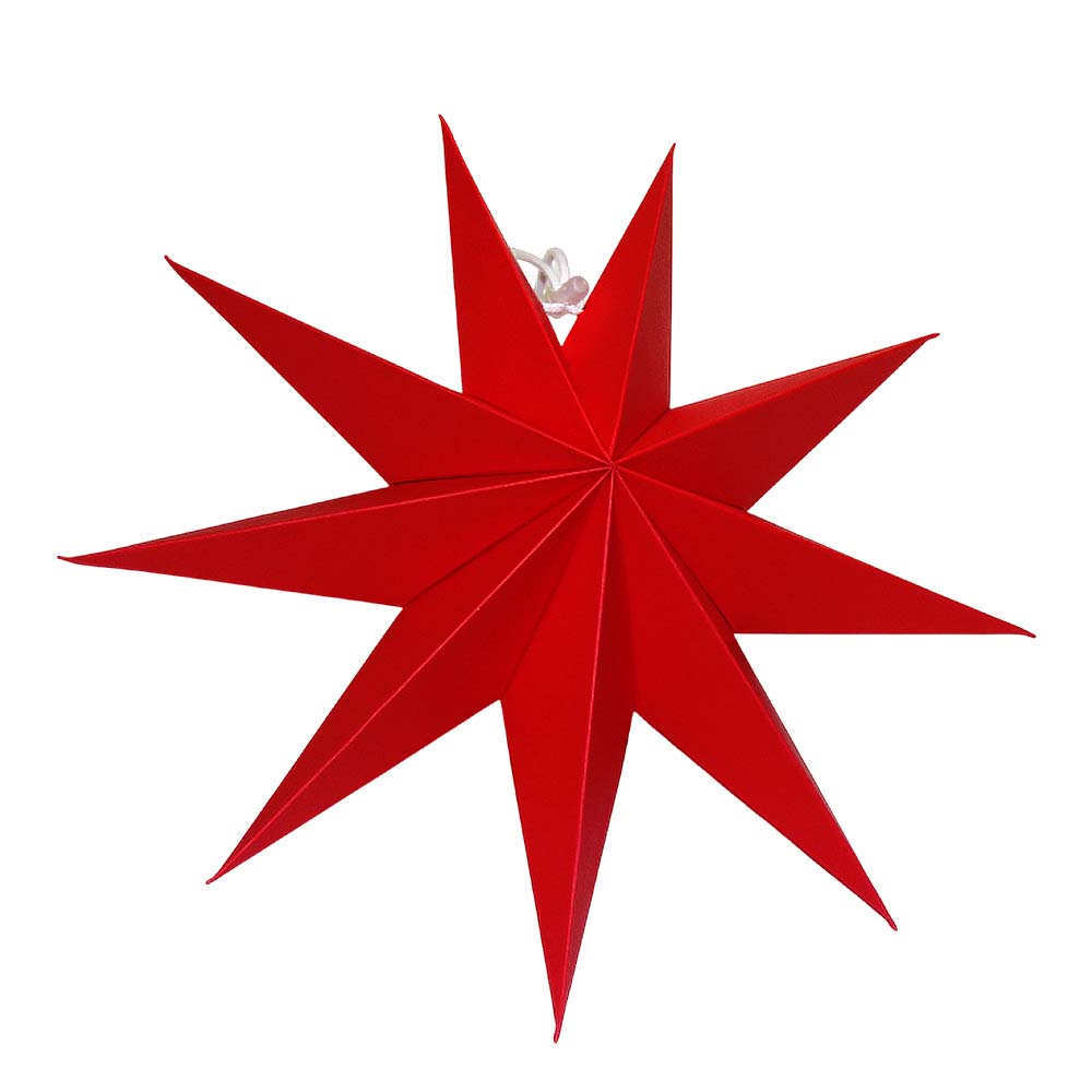 Объёмная декоративная звезда из картона диаметром 30 см с 9 лучами. Оснащена встроенным шнурком для подвешивания. Поставляется в компактном сложенном виде и быстро собирается: специальный шнурок при затягивании придаёт изделию объём и фиксирует форму. После сборки звезда остаётся устойчивой без дополнительных креплений и может использоваться многократно.
