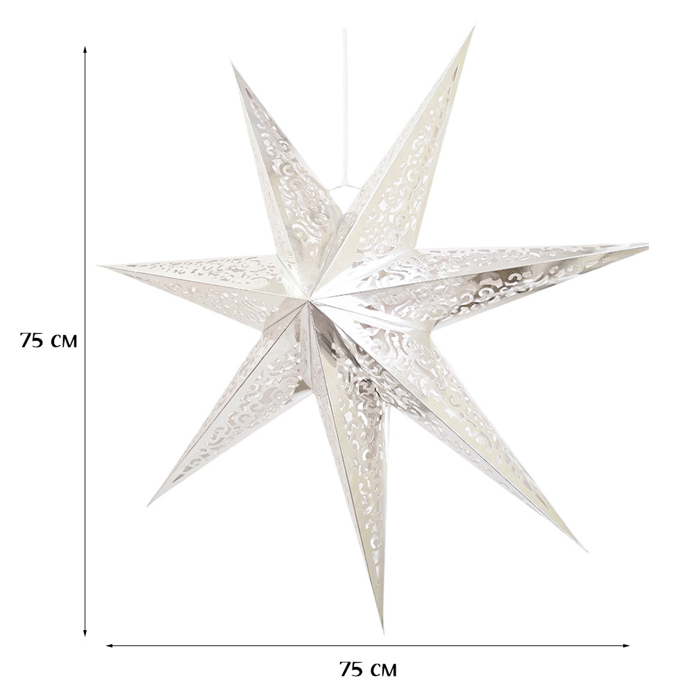 Семиконечная объемная звезда 75 см — великолепный декор из тонкого перфорированного картона. Создает красивые световые эффекты. Поставляется в сложенном виде, в комплекте шнур для фиксации объема и подвеса.